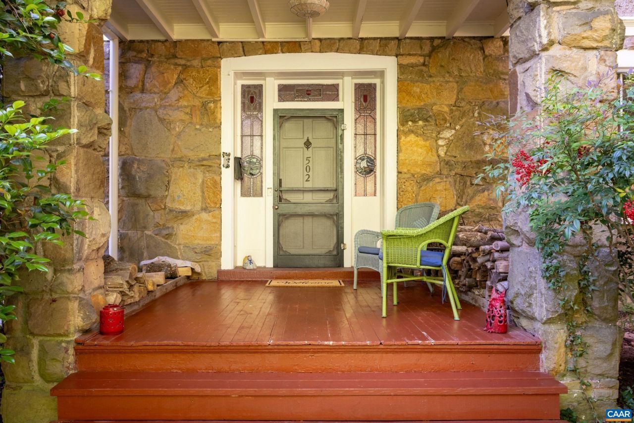 North Downtown: 1903 Arts & Crafts style home furnished w/a curated mix of mid-century modern furniture, vintage Youngstown Steel kitchen cabinets, and bespoke treasures from travels around the world. Designed by renowned architect Eugene Bradbury, featuring stone & stucco construction w/stained glass, pocket doors, fireplaces & private porches. Step into the gracious foyer and there is a living room w/fieldstone fireplace that opens to a large, covered veranda. Beyond the orig. pocket doors is a cozy den/home office. To the right of the foyer is the classic dining room w/deep-set fireplace & stained-glass windows. Kitchen is fully equipped, including gas stove & breakfast room w/floor-to-ceiling bookshelves; a butlers pantry now holds the washer/dryer. Full bath on the first floor. Up the gorgeous staircase are 4 bedrooms & 2 additional baths. Two bedrooms have private balconies, all have decorative fireplaces. Third floor can function as storage. In addition to the front porch, side porch, and upstairs balconies, the home has a lovely large yard with mature trees and plenty of parking. Inc. are landscaping/yard maintenance. Ten minute walk to Downtown Mall.